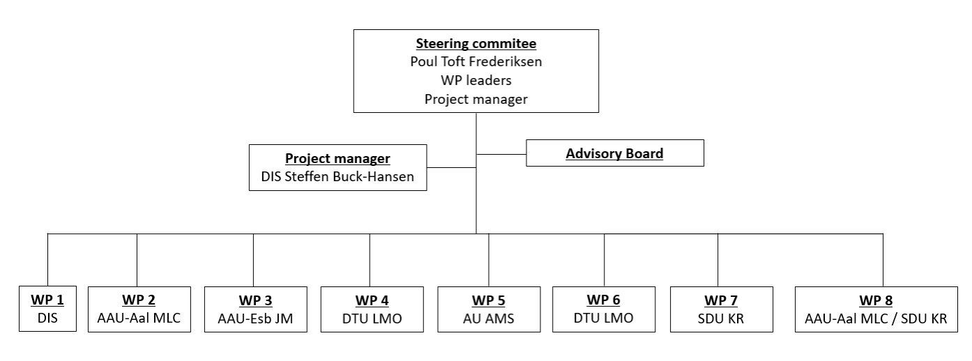 Steffen Buck-Hansen will be the manager of the project and ensure coordination and progress of all tasks. Poul Toft Frederiksen heads the steering group as the project owner to ensure that the project progresses towards commercialization of the technology. The steering group decides the direction of the project, and the project manager coordinates the project activities according to the direction given from the steering committee. The committee will have monthly meetings to ensure the progress of the project and that deliverables are achieved. WP leaders and their group members are responsible for executing work packages and committing to the goals and visions of the project. Every six months there will be seminars for all team members of the project, where status, results and challenges are discussed. There will be regular meetings (e.g. online via. Teams) between WP group members at least monthly to coordinate the work. An advisory board will be established, including at least one member from the agri-food sector, technology supplier, technology provider, and policymaker. Two meetings will be arranged, one at the beginning and one at the end of the project. The advisory board is expected to give input to the project and critically discusses the project plans and dissemination plan.