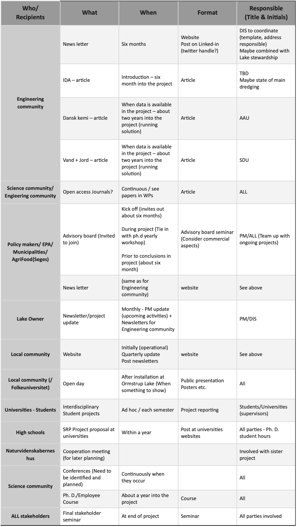RePair will develop sought-after expertise and know-how in a range of research areas and the generated knowledge will be managed carefully. Non-exploitable knowledge will be disseminated through a variety of means, e.g., across the extensive and cross-cutting networks that all the partners bring, which covers non-academic and academic partners across the globe. It will be an important task to inform non-academic about our activity to ensure greater awareness of the global P challenge i.e. pollutants of lakes and how it can be handled, and more importantly, transform the public understanding of P in lakes emphasizing that P is a resource that has to be recovered and reused. The results will be disseminated as follows: